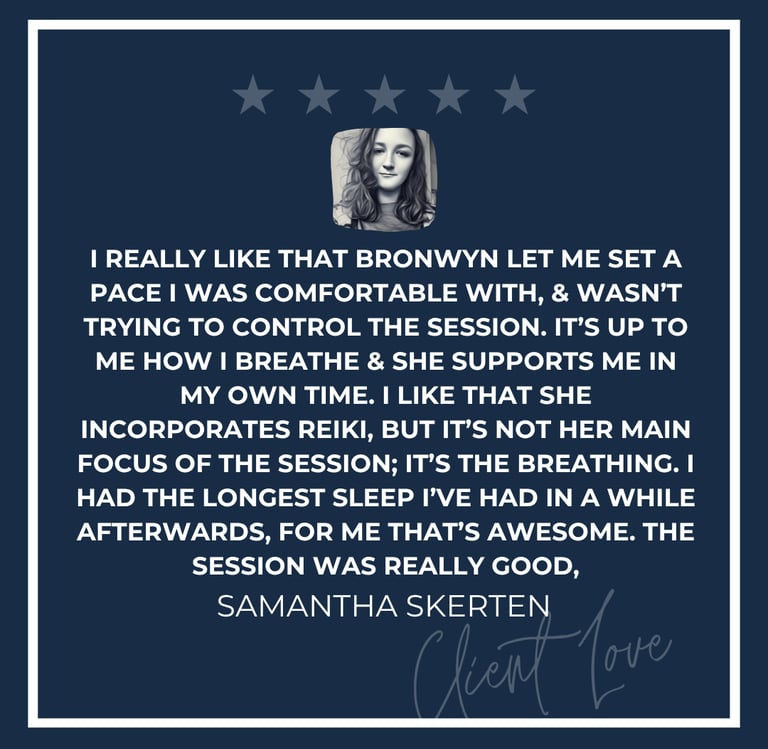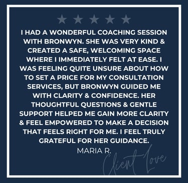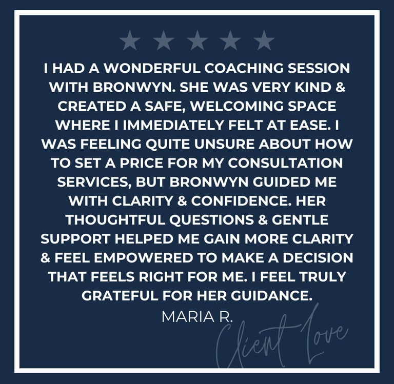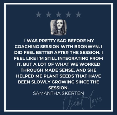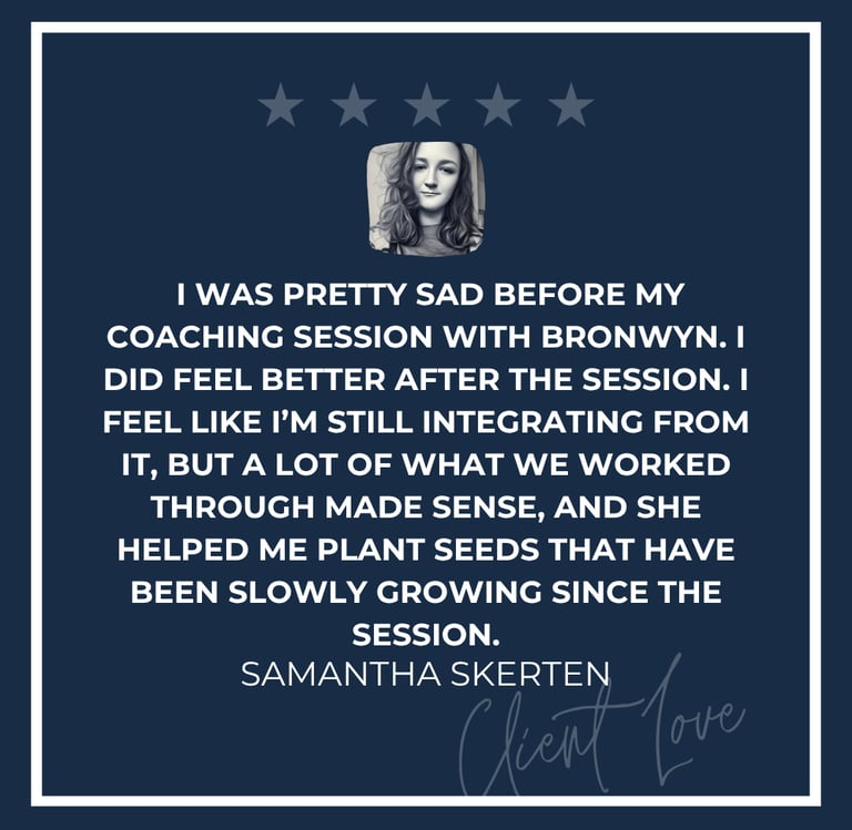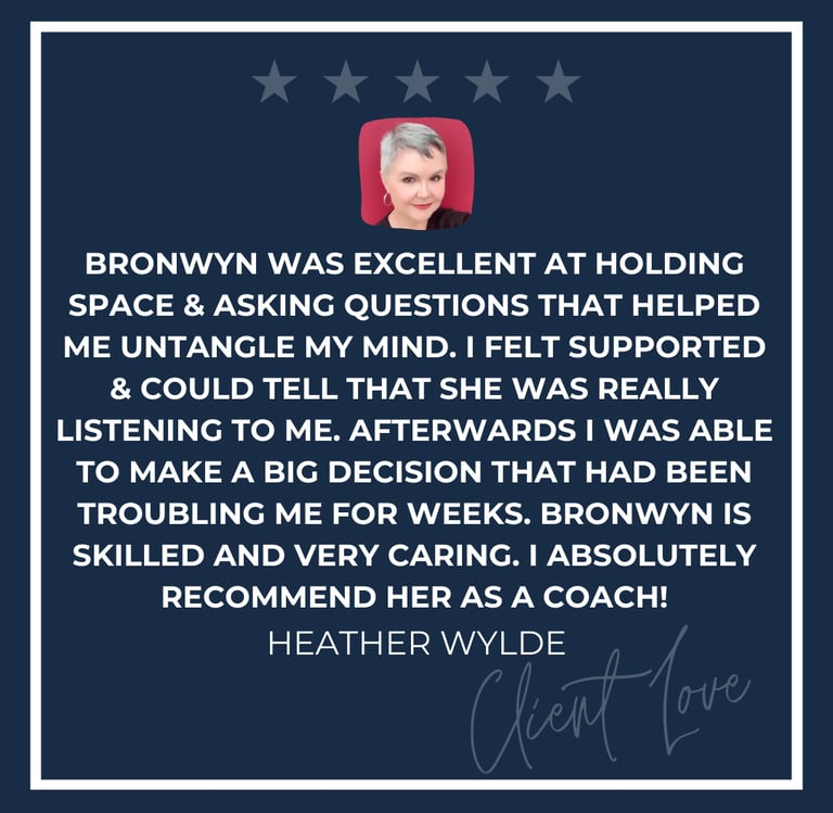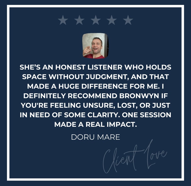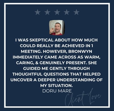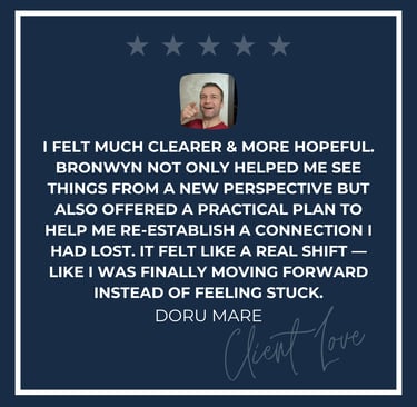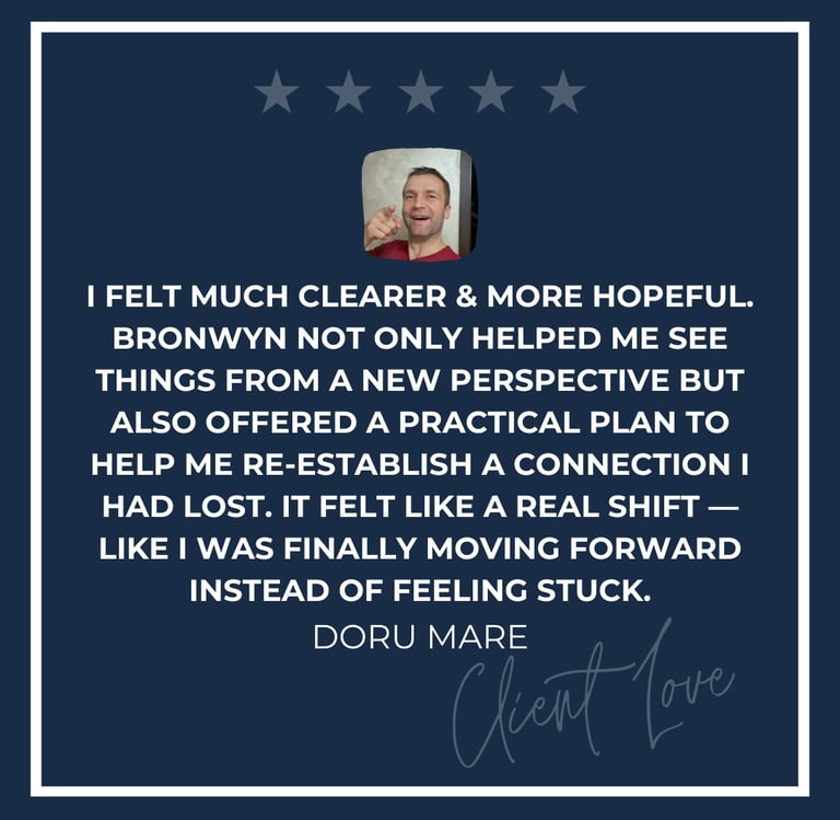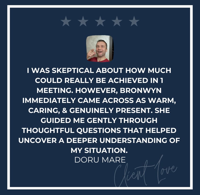 "I felt much clearer and more hopeful. Bronwyn not only helped me see things from a new perspective but also offered a practical plan. It felt like a real shift — like I was finally moving forward instead of feeling stuck."
