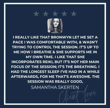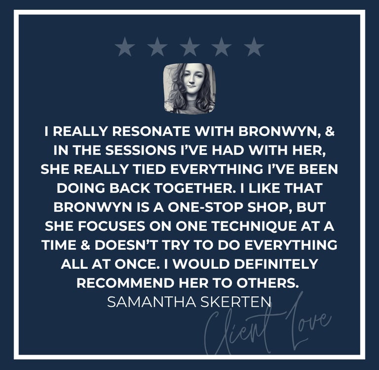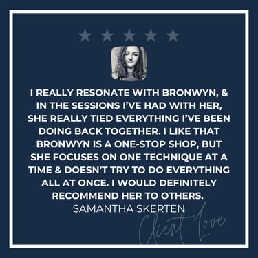 I really resonate with Bronwyn; she really tied everything I’ve been doing back together during the sessions. I like that Bronwyn is a one-stop Shop, but she focuses on one technique at a time. I would definitely recommend her to others.